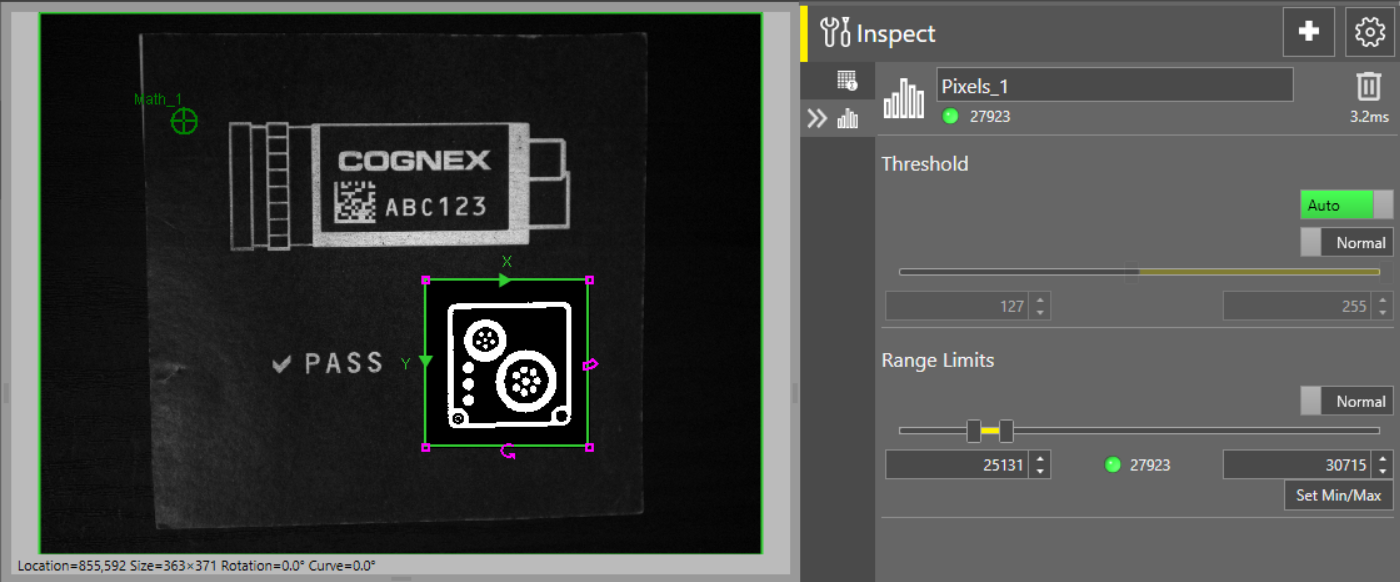 切换正常/反向切换按钮来更改生成工具结果的方式。如果设置为正常,当像素数量介于定义的最小值和最大值之间时,该工具会生成通过结果。如果设置为反向,当像素数量超出定义的最小值和最大值时,该工具会生成通过结果。