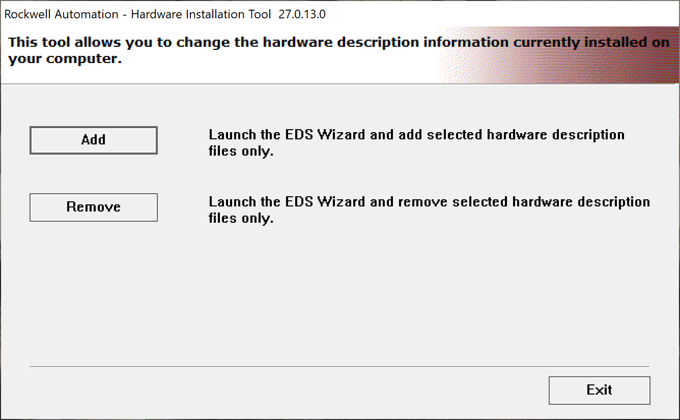 - 在 Windows 开始菜单中选择开始 > 所有程序 > Rockwell Software > EDS Hardware Installation Tool(EDS 硬件安装工具)来启动该软件。Rockwell Automation Hardware Installation Tool(Rockwell 自动化硬件安装工具)将启动。