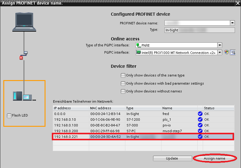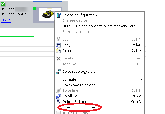 如果未正确建立连接,请右键单击视觉系统符号并从上下文菜单中选择分配设备名称。