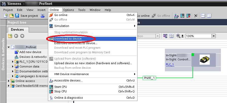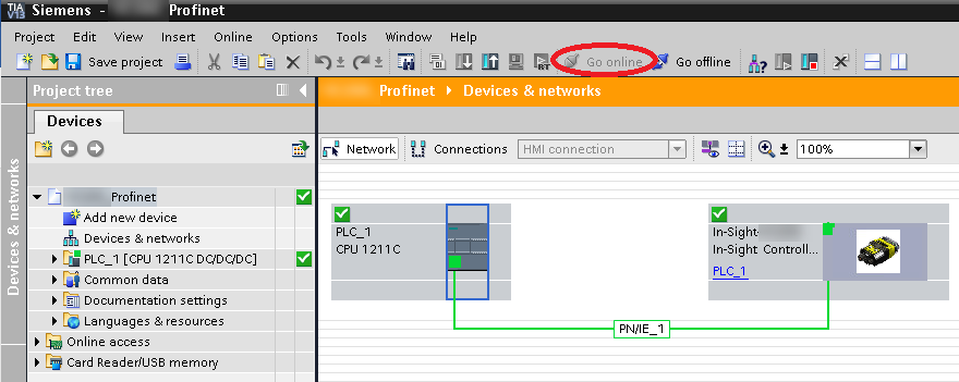 下载完成后,单击窗口顶部的联机图标。如果 PLC 和视觉系统之间的 PROFINET 连接工作正常,则设备的左上角应该会出现一个绿色标志。