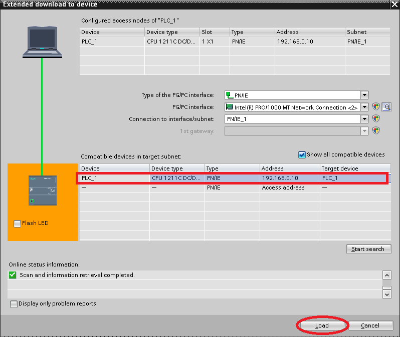 如果是第一次执行下载,则会出现扩展下载到设备窗口。在其中选择 PG/PC 接口。然后单击开始搜索按钮来显示可用设备。从列表中选择 PLC 并单击加载按钮。