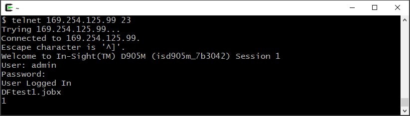 The In-Sight vision system responds on the following line with the status code of 1, indicating that the job was successfully deleted.