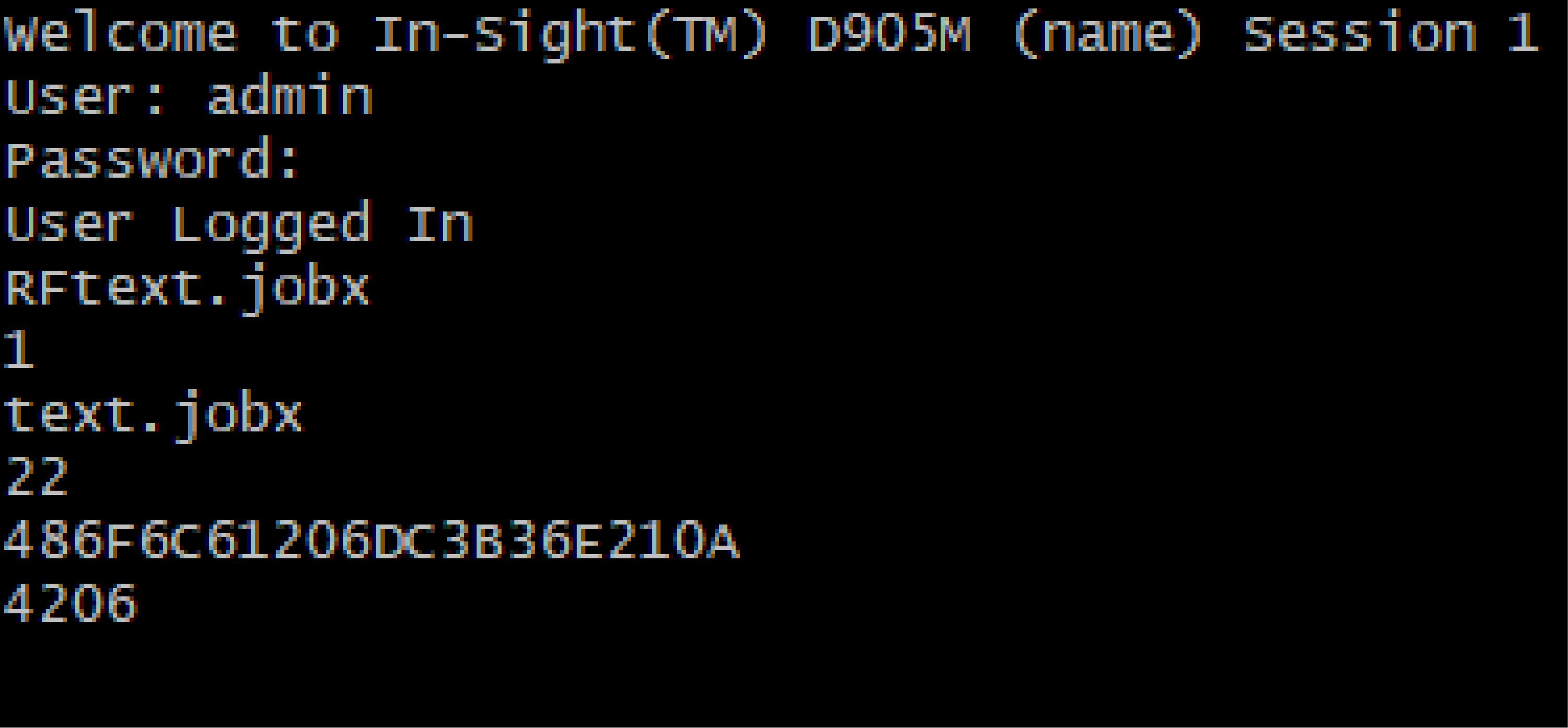After issuing the Read File command, the first line outputted to the telnet window is the status code (1), followed by the job name (text.jobx) and size (22) in bytes, then the job data in ASCII hexadecimal format. Finally, the four-byte ASCII hexadecimal checksum is displayed on the last line (4206).