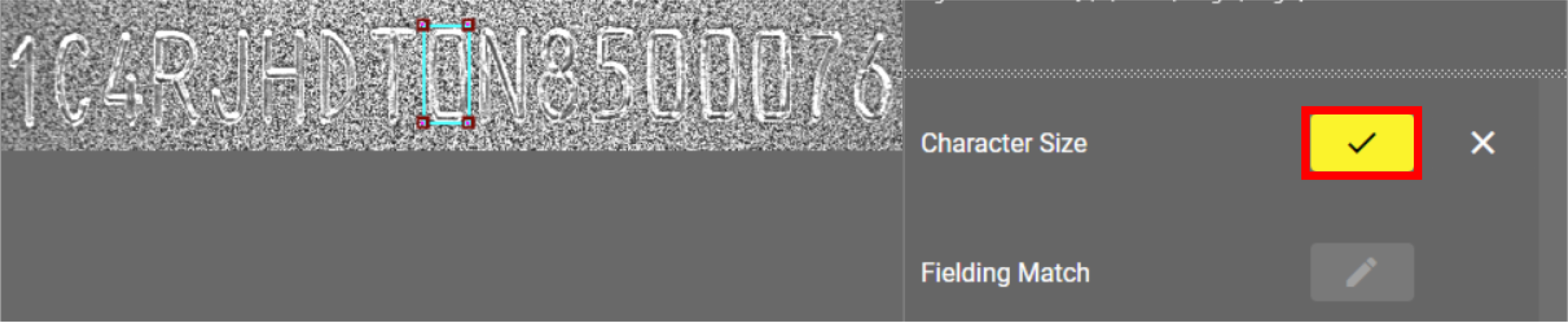 Click on the edit button next to Character Size and move the search region so it is around one of the characters you want to find. To resize the search box, click and drag the corners. Place the bounding box tightly around the character. To accept the changes, click on the check mark icon.