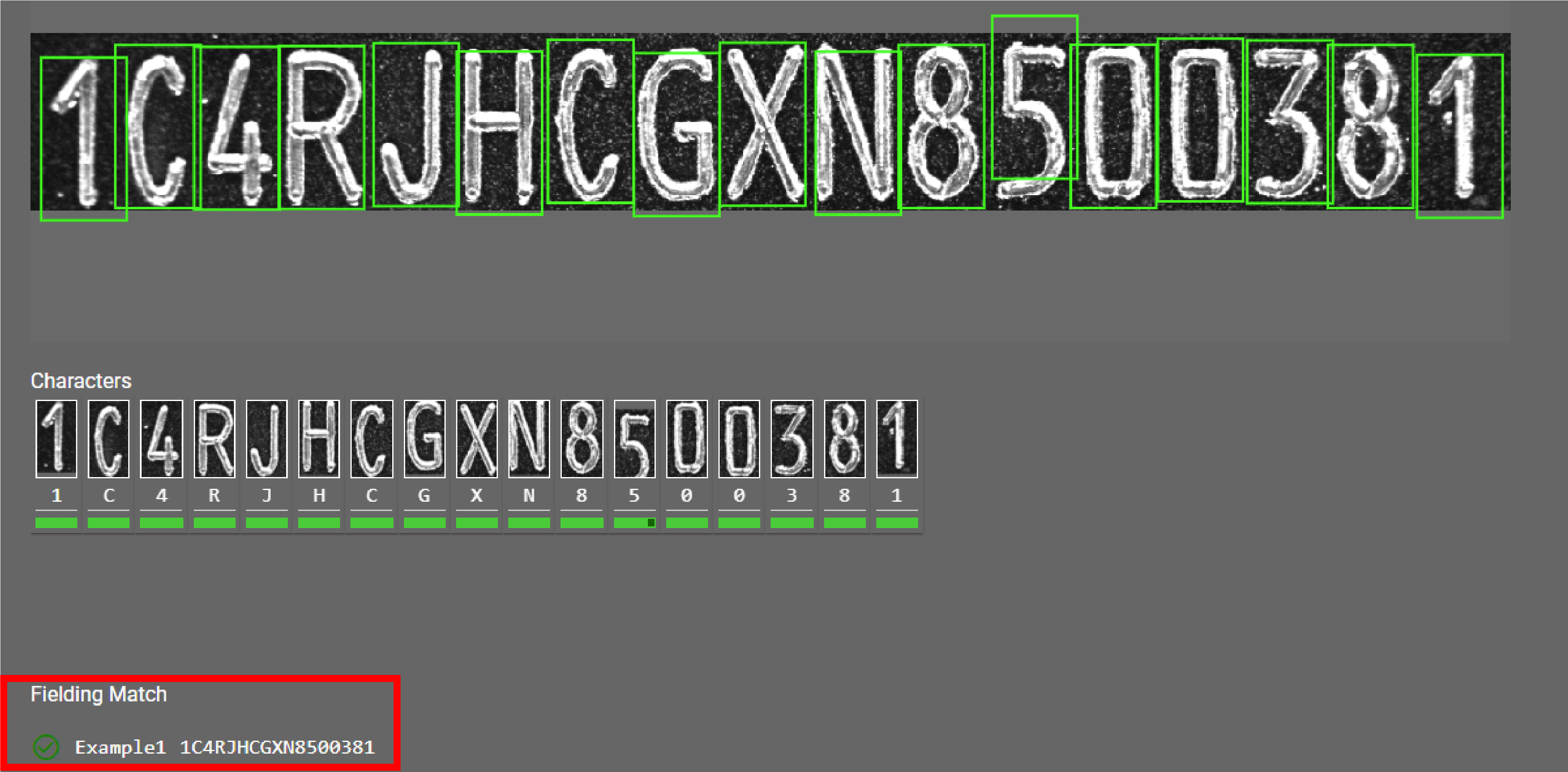 The tool reads a character pattern or character patterns on the image. The tool recognizes characters that do not fit the provided pattern, but returns an error.