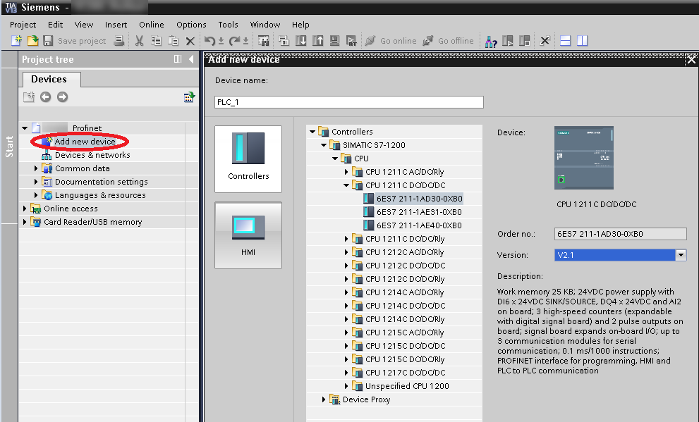 Agregue el PLC S7-1200 al proyecto. Para ello, haga doble clic sobre Agregar un nuevo dispositivo en el panel izquierdo de la interfaz de usuario y, a continuación, seleccione el tipo de PLC correcto, tal como se ilustra a continuación.