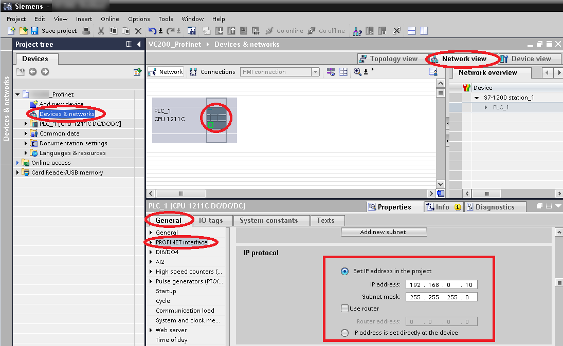 Haga doble clic sobre Dispositivos y redes en el panel izquierdo, seleccione Vista de red en la parte superior y haga seguidamente clic sobre el símbolo de CPU del PLC. Seleccione General en la parte inferior y haga clic sobre interfaz PROFINET. Establezca la dirección IP, la máscara de subred y la puerta de enlace para la CPU, como se ilustra a continuación.