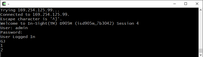 The In-Sight vision system responds with 1 to indicate that the command was executed successfully. The active job's name is "2.JOBX".