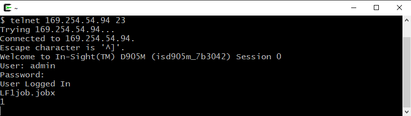 The In-Sight sensor responds with 1, indicating that the job was successfully loaded and made active.