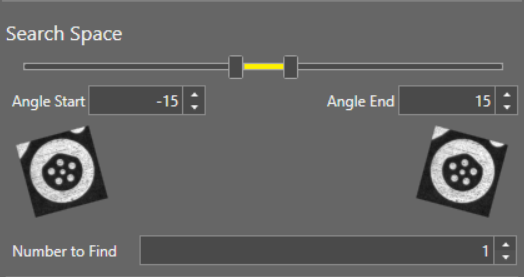 Move the start and end sliders or adjust the Angle Start and Angle End parameters to account for possible rotation in the acquired images. The Find Pattern tool only recognizes the trained pattern within the defined angles of rotation.