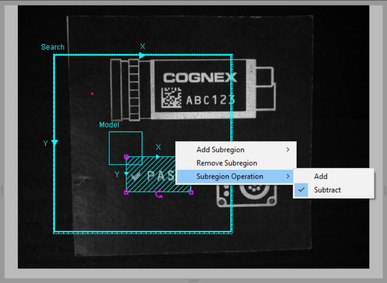 You can also add a subregion to your model region to mask out irrelevant or confusing features by right clicking on the acquisition display screen, and selecting Add Subregion > Shape in the dropdown menu that appears. By default, the subregion is added to the model region, but you can change it to subtract by right clicking on the acquisition screen, and selecting Subregion Operation > Subtract in the dropdown menu.