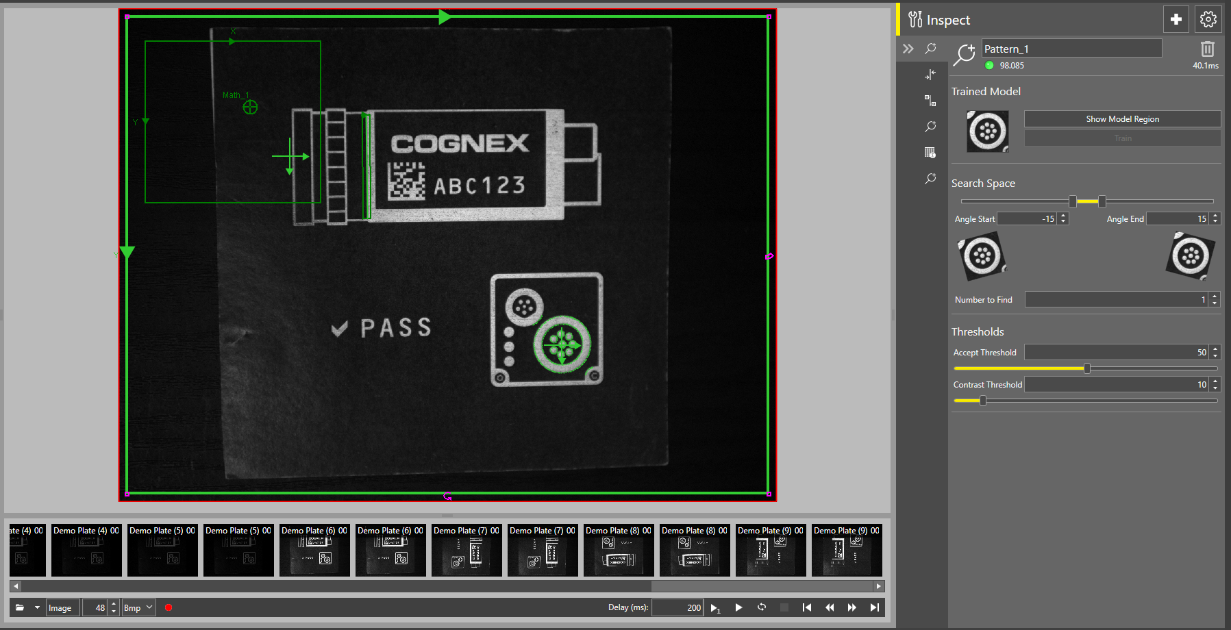 If the Find Pattern tool is not adequately identifying your trained model in your images, you can adjust the thresholds to broaden or narrow down the pattern matches.