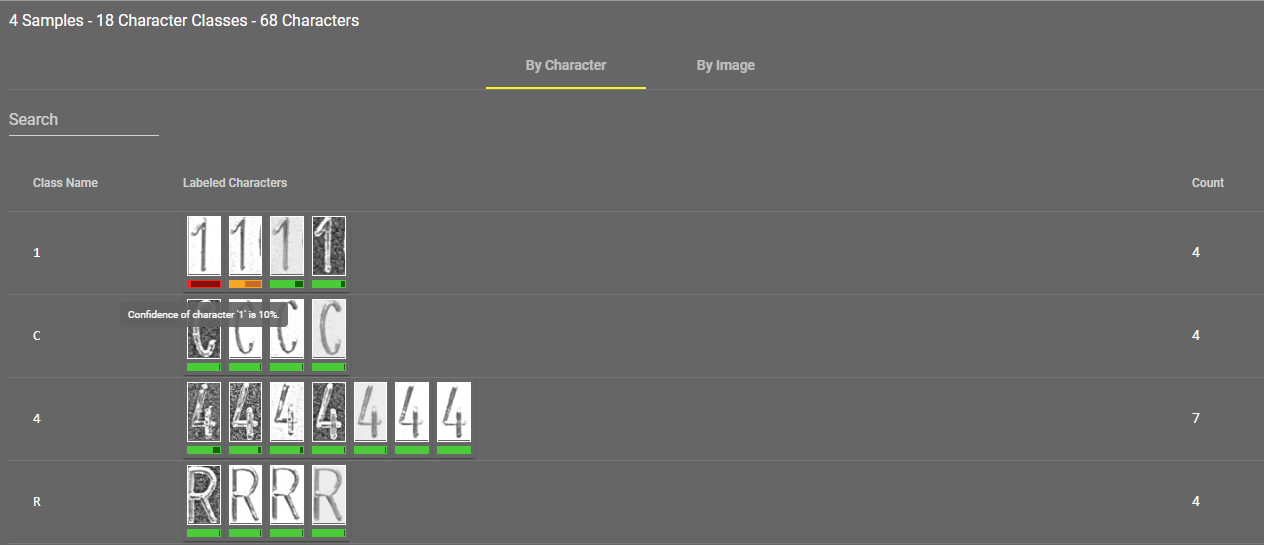 Shows the number of trained characters and source images, and the confidence level of the tool in a given character. The lower the percentage is, the less likely that a result is correct.
