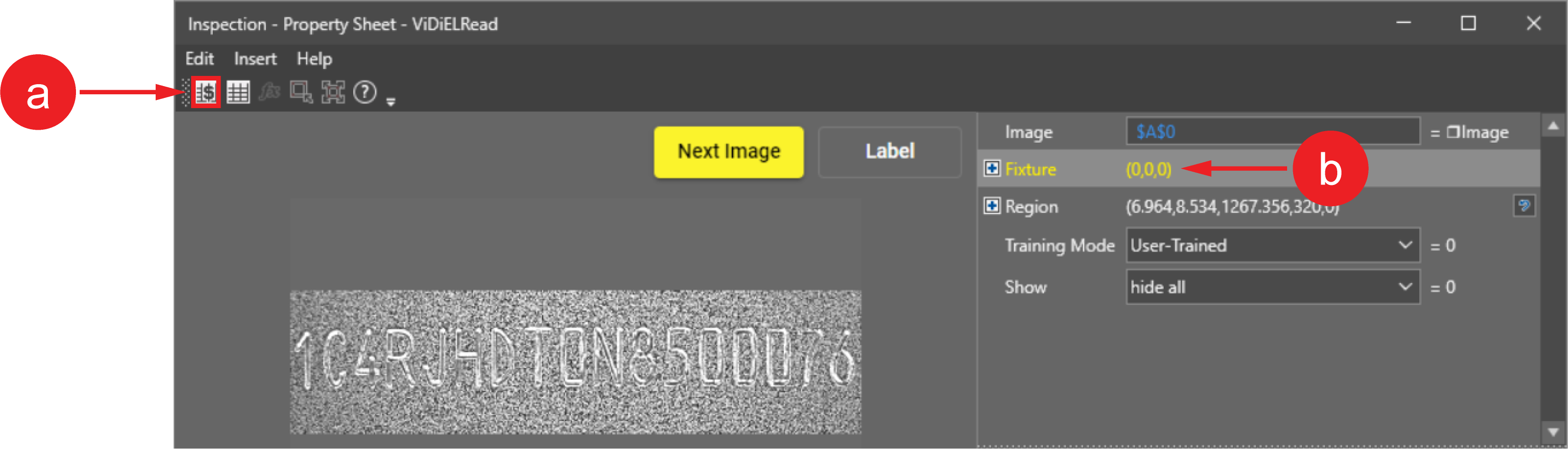 Click on the edit button next to Train. Type in the corresponding characters for the selected letters and numbers on each image. Label and train all expected characters (A-Z, 0-9) for your application. To jump to a new image, click on Next Image. You need to train at least 3 images. The more images and characters you train, the higher the quality of your output is.