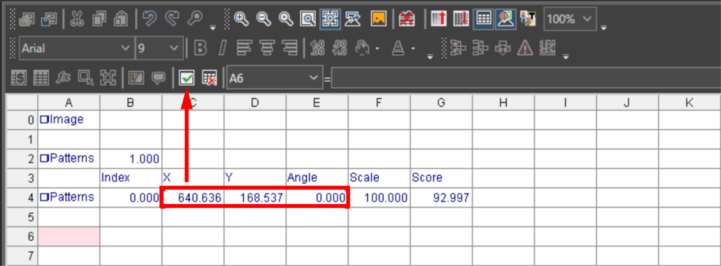 The tool reads a character pattern or character patterns on the image. The tool recognizes characters that do not fit the provided pattern, but returns an error.