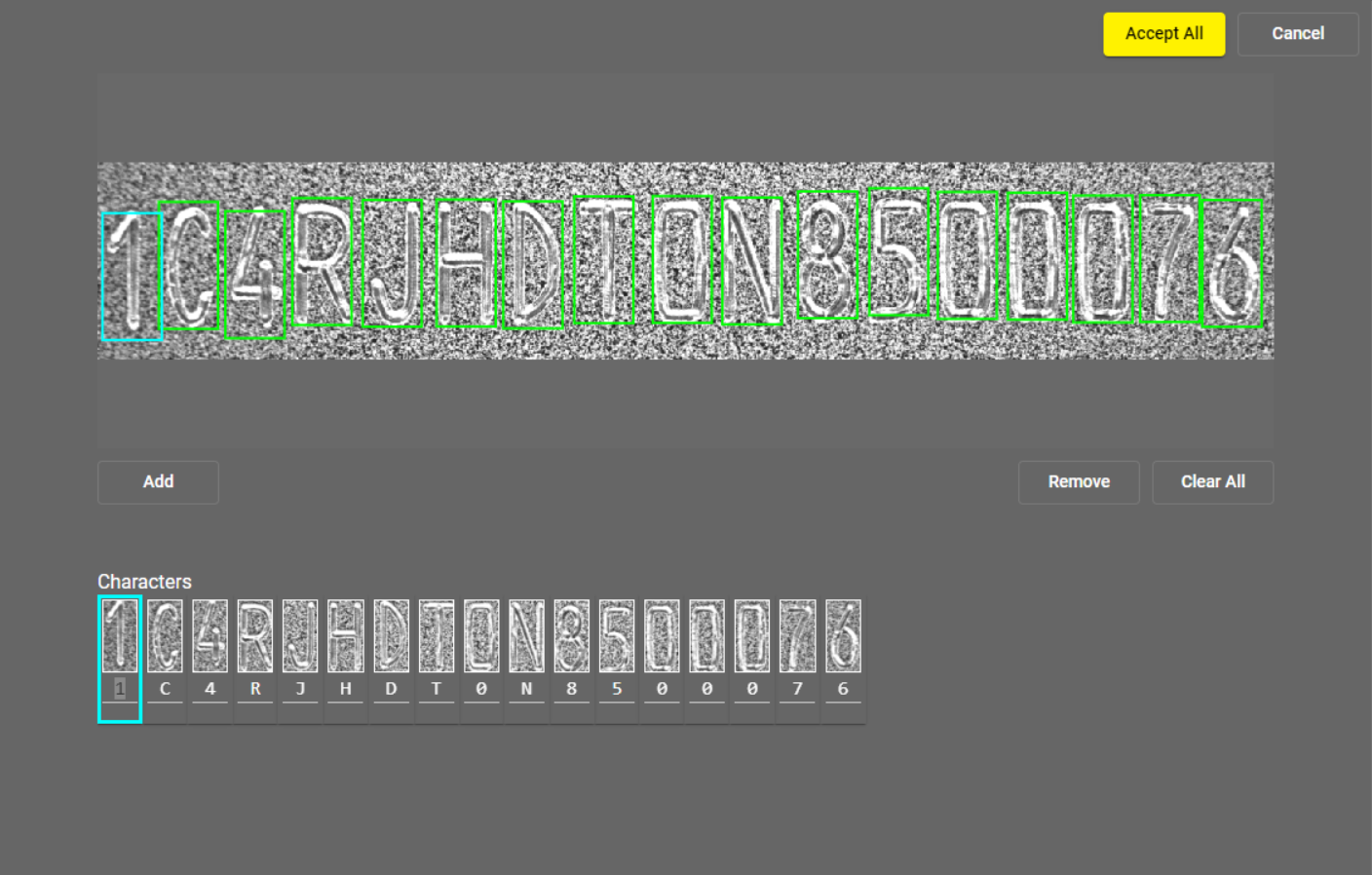 By default, the tool identifies possible characters on the image by placing a green bounding box around them. You can move the bounding boxes freely, but the size can only be modified under the Character Size setting. To add more bounding boxes, click on Label or one of the boxes, select the Add button, and click on the image. To stop adding bounding boxes, click on Done. To remove a box, select it and click on Remove. To remove all your boxes, select the Clear All option. To accept the training, click on Accept All.