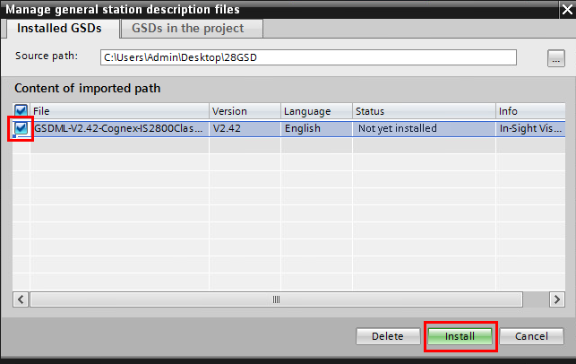 Marque la casilla situada delante del archivo GSDML y haga clic sobre Instalar.
