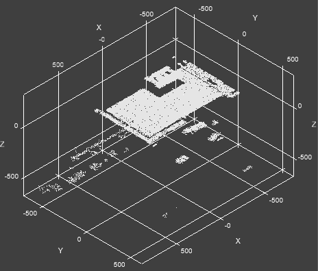 Change the view to display the point cloud on the Y-axis and a reverse X-axis, in a Z-axis direction. In other words, this view shows the point cloud "from the bottom", with the perspective aimed toward the camera sensor. |