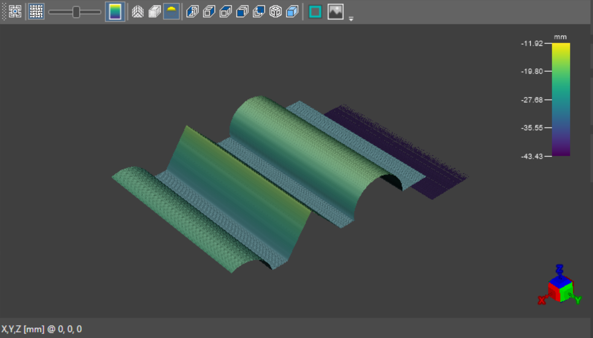 When set to 3D mode with the 3D button, the image viewer of the 3D-L4000 Series Acquisition Wizard shows the 3D point cloud constructed from the 2D profiles acquired by the device.