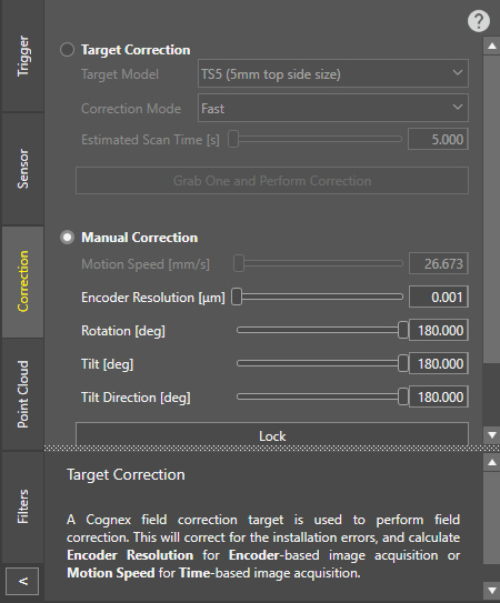 Manual Correction: When selecting this method, you must specify the identified installation errors (in terms of rotational angles) yourself. Likewise, you must set the appropriate Encoder Resolution (in case of encoder-based image acquisition) or Motion Speed (in case of time-based image acquisition) values manually.