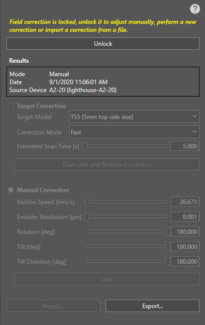 Once Field Correction is performed, the settings cannot be modified unless clicking the Unlock button, or performing a new correction. The results of the correction then appear under the Unlock button: