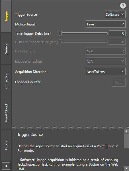 Tip: Make sure that the Encoder Direction is specified correctly, based on the physical setup of the vision system. Otherwise, the generated point cloud will be mirrored along the motion direction.