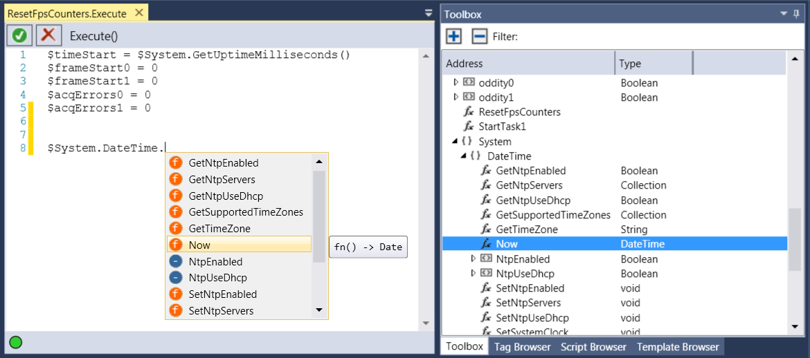 The "dollar functions" are those functions that are included (and published) in the In-Sight 3D API and allow users to programmatically invoke functions or HMI controls. With the Script Editor open, the Toolbox provides a list of $ functions and properties. These can be dragged from the Toolbox directly into the Script Editor. Alternatively, typing $ in the editor will open an intellisense window, listing all available $ functions and properties and their syntax.