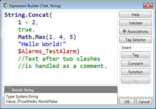| Result | It attempts to evaluate the expression and returns the resulting value. If there are errors, it provides quick feedback on possible syntax errors. This element is only visible (can be collapsed still) if the entered expression is invalid. If collapsed, the parser error is shown as a tooltip. |