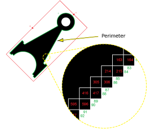 - Threshold: The default setting was used, which automatically calculates the greyscale Threshold value. In this image, the greyscale value differences are very pronounced and it is very clear which pixels are the dark pixels and which are the light. In applications where there is a more subtle gradation and the automatic threshold setting does not separate the values very well, using Histogram functions, such as the HistHead or HistTail functions, to determine the greyscale intensities in different regions of the image can be very helpful.