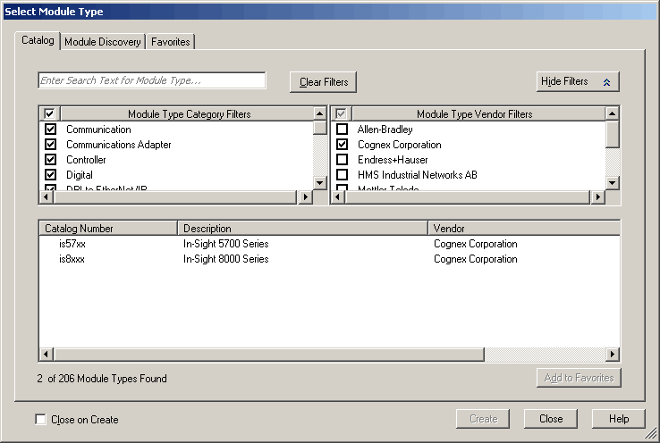 From the Select Module Type dialog, select the type of In-Sight vision system that will be connected to the PLC and click Create.