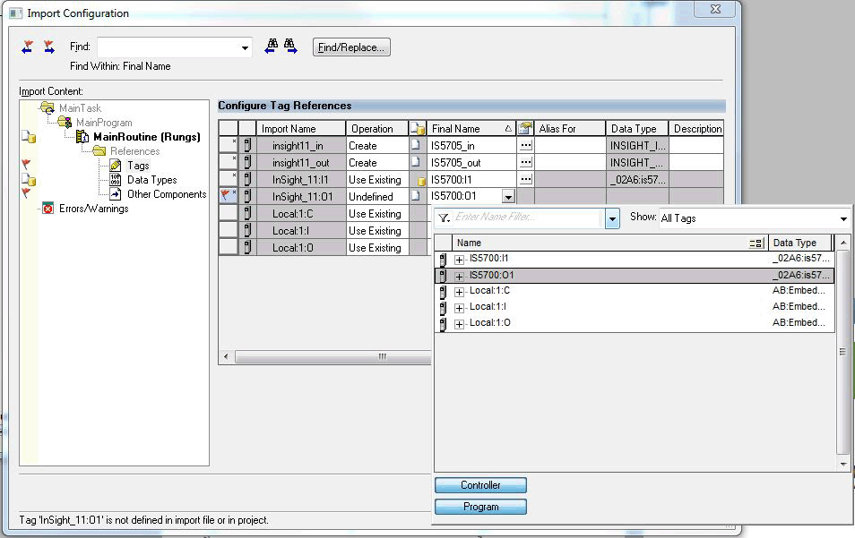 If using In-Sight 5.x.x firmware, set the InSight_11:I1 and InSight_11:O1 tags to the connection controller tags in the project so that they match the name given to the In-Sight vision system connection.