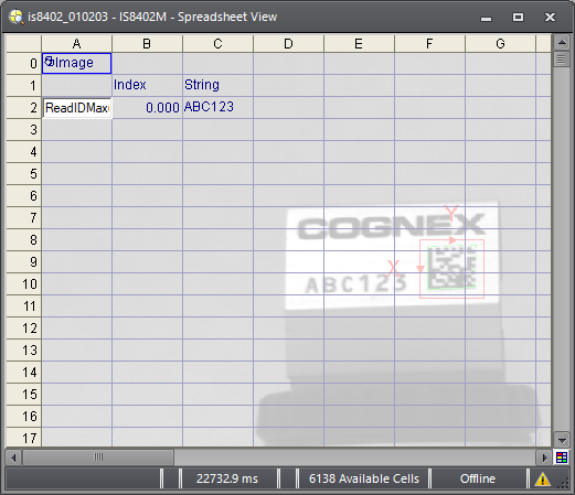 Assume that an In-Sight spreadsheet contains an IDMax data structure in cell A2 that was obtained from a ReadIDMax function. The decoded string is returned in the adjacent cell, as follows: