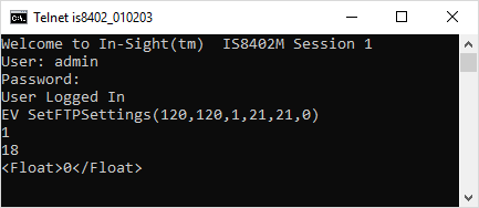 This example sets the Idle Timeout, Read Timeout, Connection Retry, Local Port, Remote Port, and Passive Transfers FTP settings on an In-Sight 8402 vision system. While logged on to the vision system from a telnet client, issue the following command: EV SetFTPSettings(120,120,1,21,21,0)