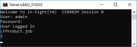 The In-Sight sensor responds with 1, indicating that the job was successfully loaded and made active.