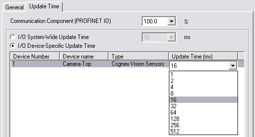 Note: If the update time is left at the default value of 1 ms, a significant reduction in vision tool performance may be observed when the PLC is connected to an In-Sight vision system. This reduction can be alleviated by increasing the cyclic update time to either 8 ms or 16 ms.