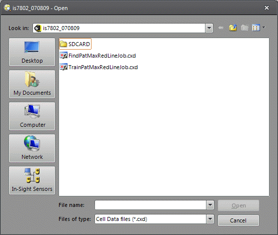 - Choose the location that contains the .CXD file to open. The Look in: drop-down list contains all local drives, network drives, detected In-Sight vision systems, emulators, RAMDisk and SD Card folders on your local subnet, as well as any devices defined in the Explorer Host Table. To list the available .CXD files on a vision system, select the vision system from the drop-down list.