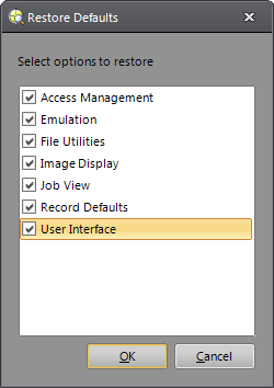 The Restore Defaults dialog allows you to reset specific options to their original values as when In-Sight Explorer was installed. This can be useful if, for example, if you changed display resolutions and certain dialogs are being displayed at inaccessible regions of the screen. Options can be restored by individual category or all at once, depending on the checkboxes selected.