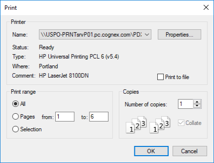 The Print dialog allows you to select a specific printer and print data.