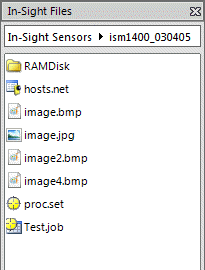 - Store .JOB Files: To save a .JOB file to a sensor or emulator's RAMDisk folder, use the Save As dialog and, using the Look in: drop-down list, set the file's location to the RAMDisk folder of the desired sensor or emulator. Alternately, you can also drag a .JOB file from the In-Sight Files pane and drop it into the desired sensor or emulator's RAMDisk folder; or you can use the right-click shortcut menu in the In-Sight Files pane to copy and then paste a .JOB file into a RAMDisk folder.