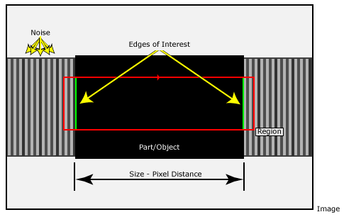 The Caliper function is used to examine an image and locate a 1-dimensional edge, a change in the greyscale values of neighboring pixels. The function examines a specified portion of the image (defined by the Region parameter) and scans for a transition in the greyscale values of pixels along one direction, from dark to light or light to dark. Either a single edge or a pair of edges (that are separated by an expected width) can be located by the function.
