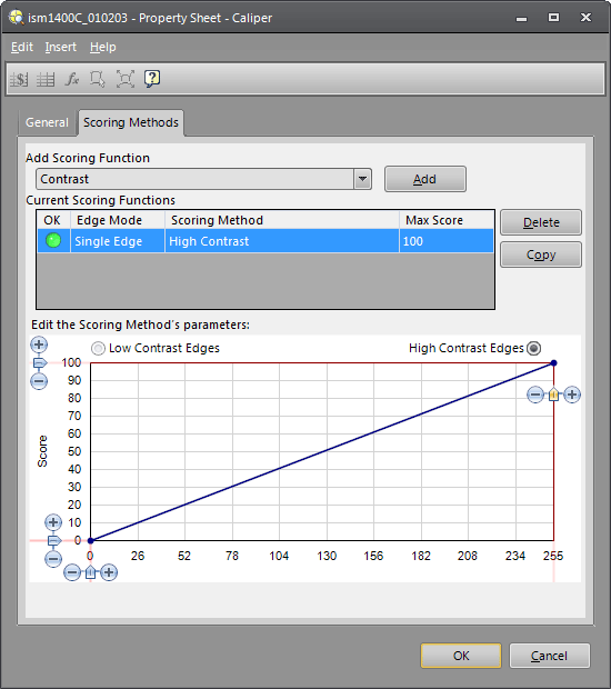 Available for edge pairs and single edges, this scoring method is based on the edge candidate's contrast, which is the change in contrast across adjacent pixels that make up the edge. With edge pairs, the average contrast of the two edges is used. Adjust the scoring settings to assign scores to edges or edge pairs based on the contrast, with a score range of 0 to 100. The basis for calculating the score can be either high contrast edges, or low contrast edges. |