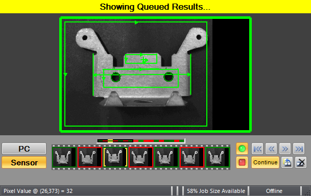 When finished monitoring the results, click the Online button in the toolbar again to place the vision system Offline. When the vision system is placed Offline, no new results are added to the filmstrip. When an existing pass or fail graphic is selected in the filmstrip, the stored image is loaded to the display area and all the steps except are disabled. Click the Continue or Clear Queue button to return to the standard Offline mode of operation.