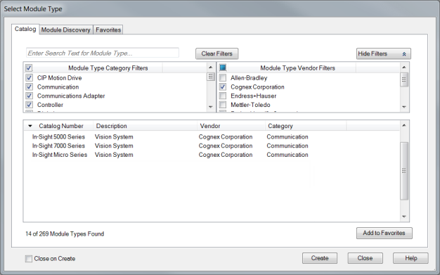 From the Select Module Type dialog, select the type of In-Sight vision system that will be connected to the PLC and click the Create button.