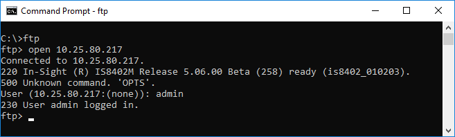 - At the FTP command prompt, type open Address, where Address is the IP address obtained in Step 1. If the connection is successful, a message similar to the following will appear: 220 In-Sight (R) 5100 Release 3.40.00 (2240) ready (is5100_010203).