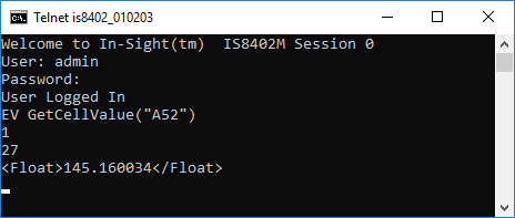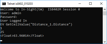 The In-Sight sensor returns 1 to indicate that the command was executed successfully. The number of characters (in bytes) is followed by the value in the cell (integer, floating point, or text string).