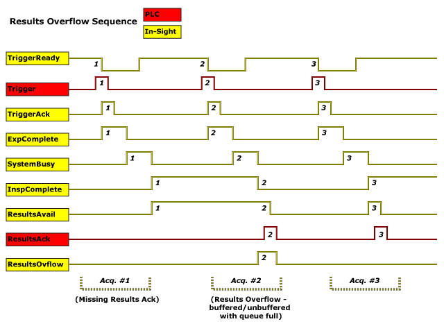The following diagram illustrates the typical behavior of the In-Sight vision system in response to a Automation Controller triggering an acquisition and inspection cycle: