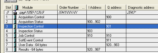 Tip: The Siemens Step 7 software will assign default I/O addresses to each of the modules added for the In-Sight vision system based on the definitions of each module in the In-Sight GSD file (see the above figure). It is allowed to change any or all of these I/O addresses. All of the modules that map out discrete bit data (acquisition control and status, inspection control and status, and soft event control) must be assigned addresses that are within the process-image input and output memory areas of the PLC. Most newer firmware on Siemens S7 series PLCs allow the sizes of this memory area to be changed (default size is 256 bytes, I0.0 - I255.7, Q0.0 - Q255.7). Other older firmware or models that are not configurable (consult Siemens PLC documentation) have a fixed size, usually 256 bytes. This can be seen in the picture above where each of the discrete bit data modules are mapped into I/O addresses starting at 0 and the byte/word modules are assigned addresses starting just above the process-image input and output memory areas of the PLC (256 and higher).