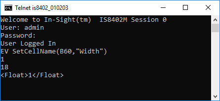 The In-Sight sensor returns 1 to indicate that the command was executed successfully and the number of characters in bytes (18). Finally, the results are returned in XML format.