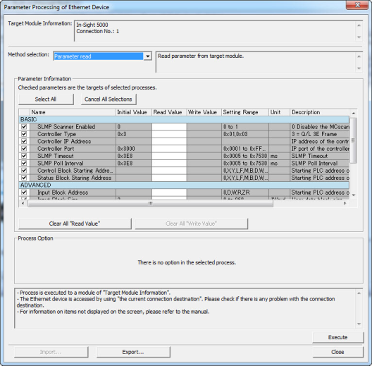 - Click the Execute button. The vision system's parameter values will be displayed in the Read Value column.