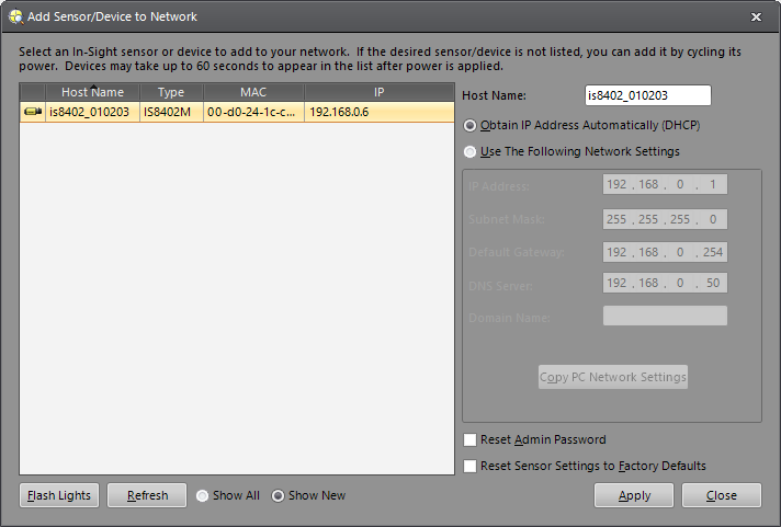 - Flash Lights: Causes the LEDs on the In-Sight device to flash, to help you visually locate it. This button toggles to the Stop Flashing button, and the LEDs continue flashing until you do one of the following: click Stop Flashing, close the Add Sensor/Device to Network dialog or select another device in the list.